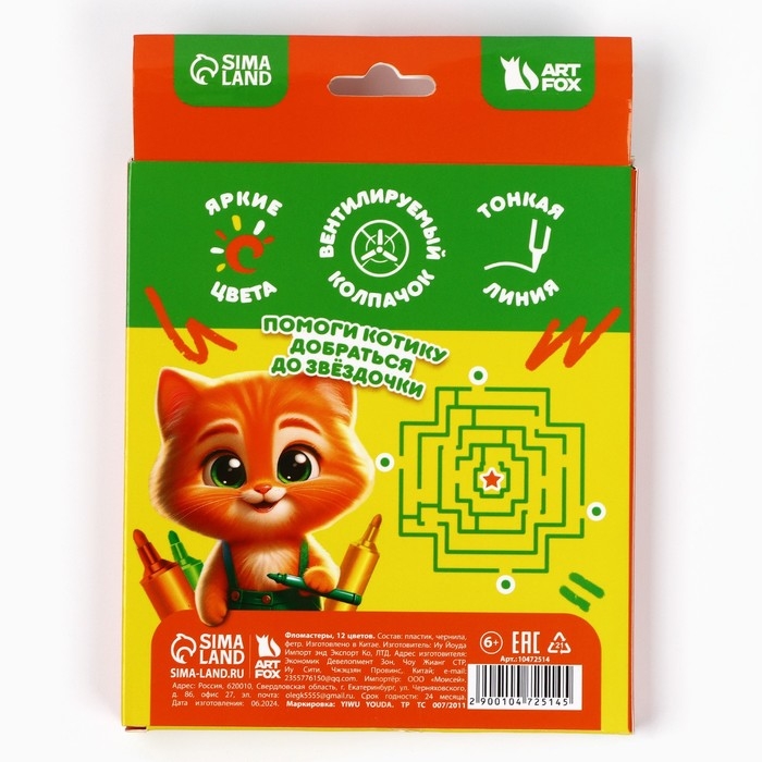 Фломастеры 12 цветов, вентилируемый колпачок, «1 сентября: Кот»