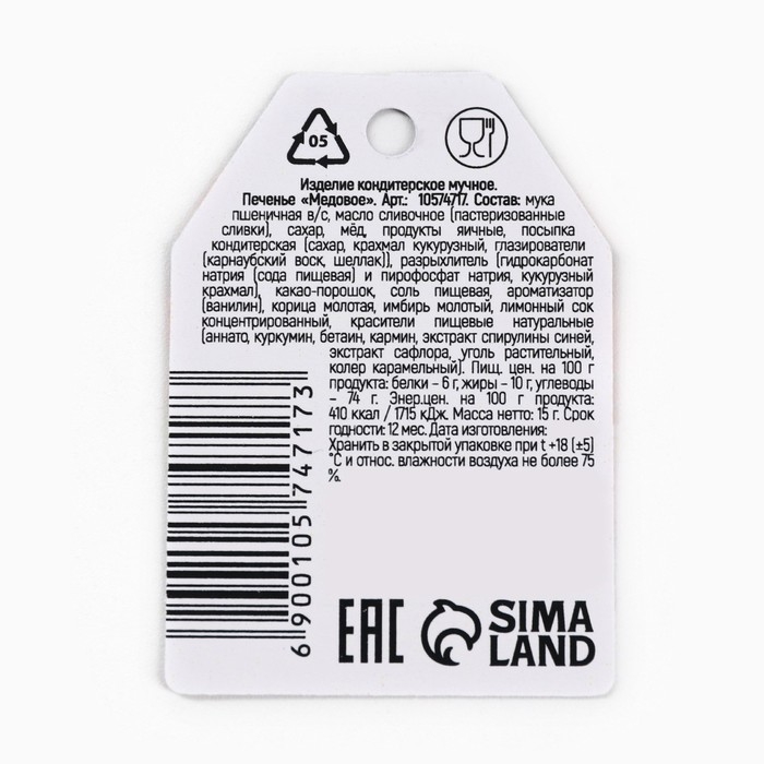 Состав: мука пшеничная в/с, масло сливочное (пастеризованные сливки), сахар, мёд, продукты яичные, посыпка кондитерская (сахар, крахмал кукурузный, глазирователи (карнаубский воск, шеллак)), разрыхлитель (гидрокарбонат натрия (сода пищевая) и пирофосфат натрия, кукурузный крахмал), какао-порошок, соль пищевая, ароматизатор (ванилин), корица молотая, имбирь молотый, лимонный сок концентрированный, красители пищевые натуральные (аннато, куркумин, бетаин, кармин, экстракт спирулины синей, экстракт сафлора, уголь растительный, колер карамельный).
