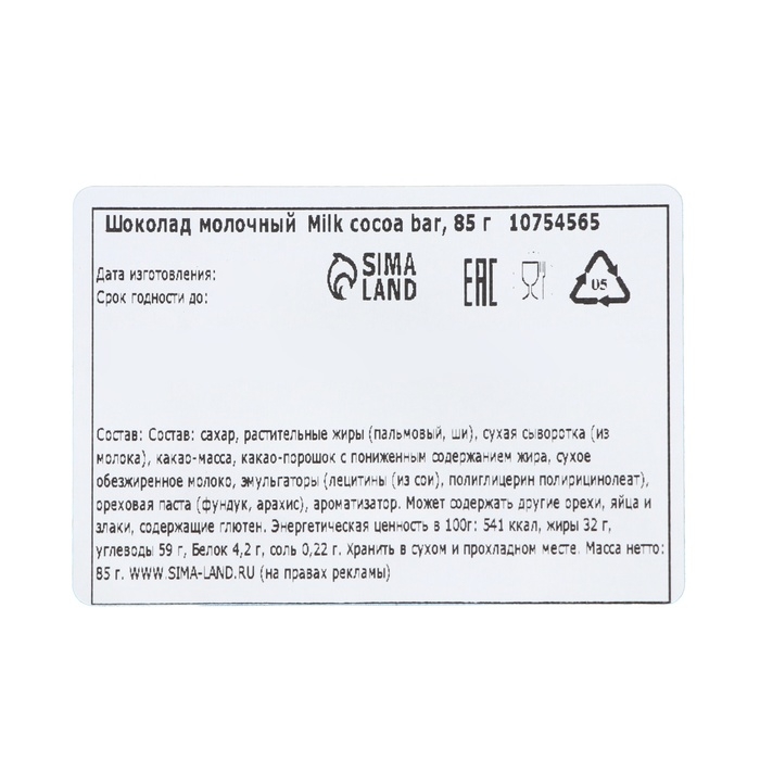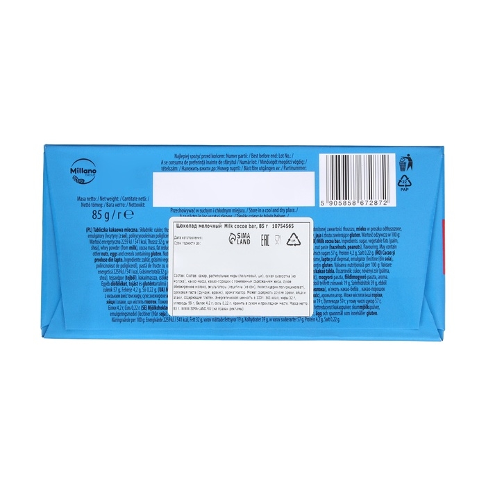 Шоколад молочный Milk cocoa bar, 85 г