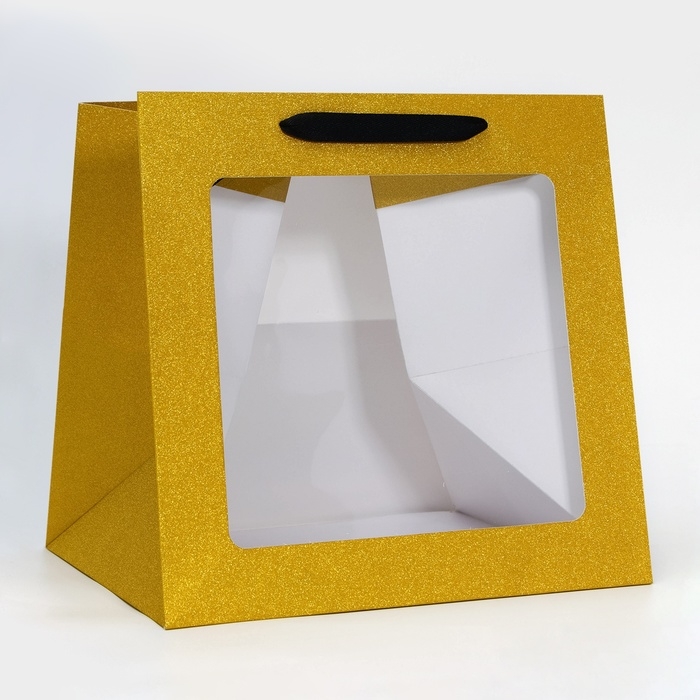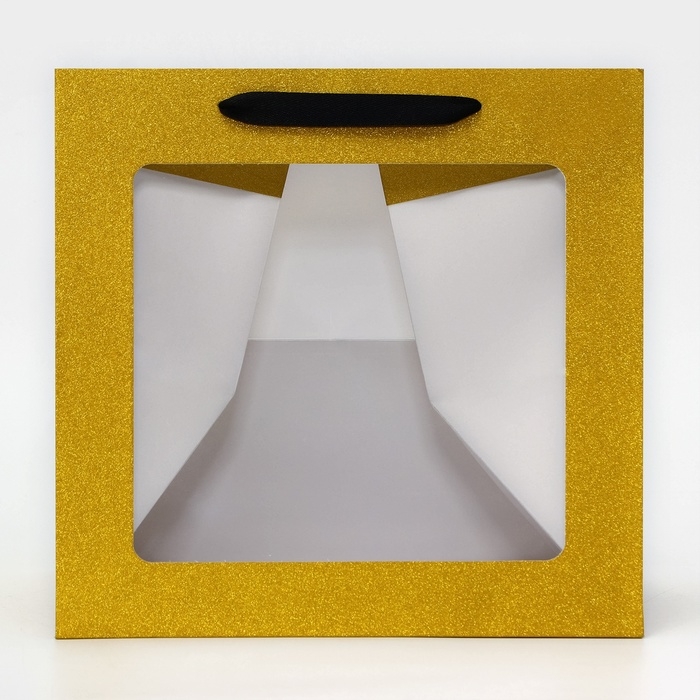 Крафтовый пакет с квадратным дном и окном, размером 30 х 30 х 30 см, золото с глиттером