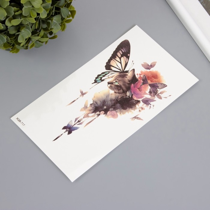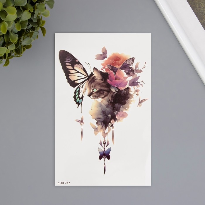 Татуировка на тело цветная "Кошка в акварельных цветах" 11,4х21 см