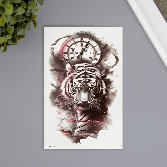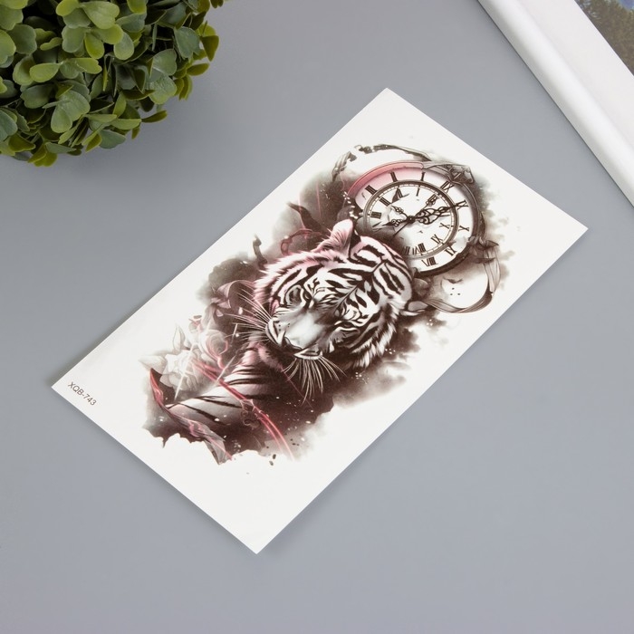 Татуировка на тело цветная "Тигр на фоне часов" 11,4х21 см