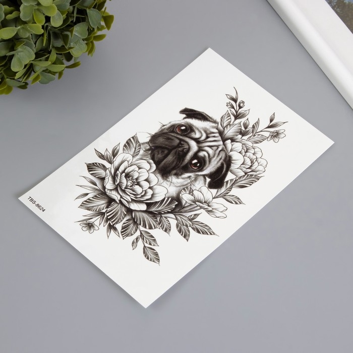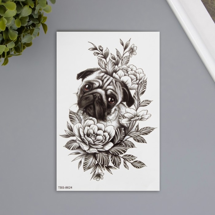 Татуировка на тело цветная "Мопс в цветах" 12х19 см