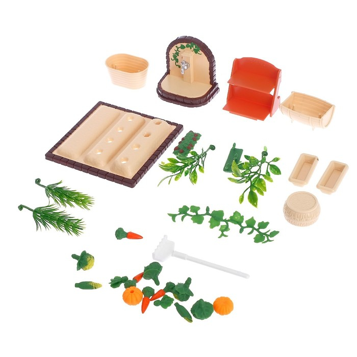 В набор входят овощи, растения, ягоды, инструменты для уборки и другие полезные вещи.