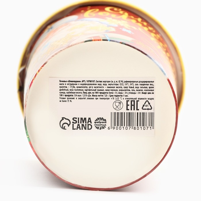 Состав: маргарин (м. д. ж.: 82 %), рафинированные дезодорированные масла в натуральном и модифицированном виде, вода, эмульгаторы: Е322, Е471, Е475, соль поваренная пищ., краситель – Е160а, ароматизатор, рег-р кислотности – лимонная кислота, сахар белый, вода питьевая, арахис дроблёный, мука пшеничная, картофельный крахмал, какао-порошок, разрыхлитель, соль, ванилин, ксантановая камедь, сорбиновая кислота.