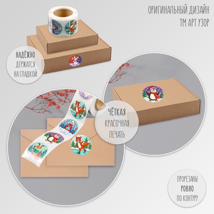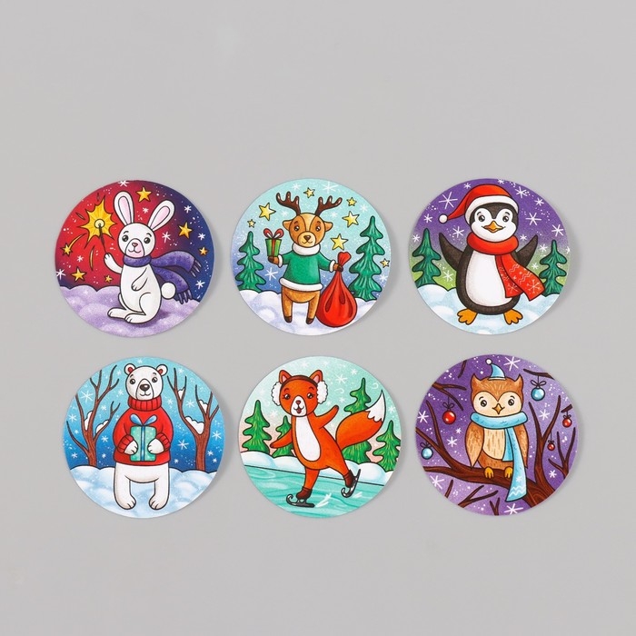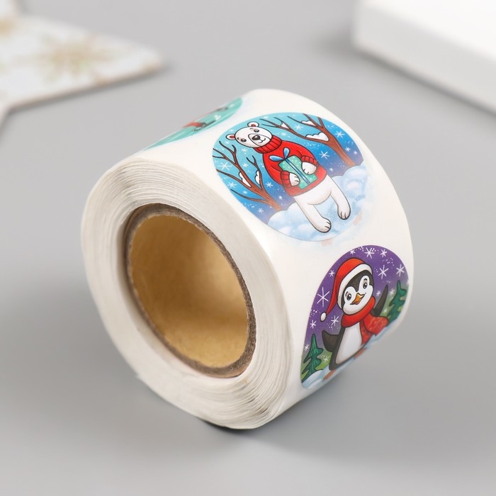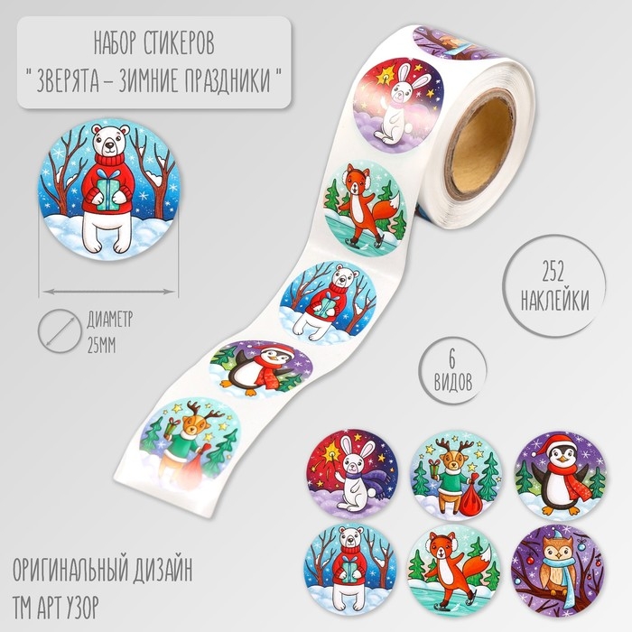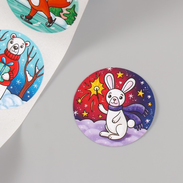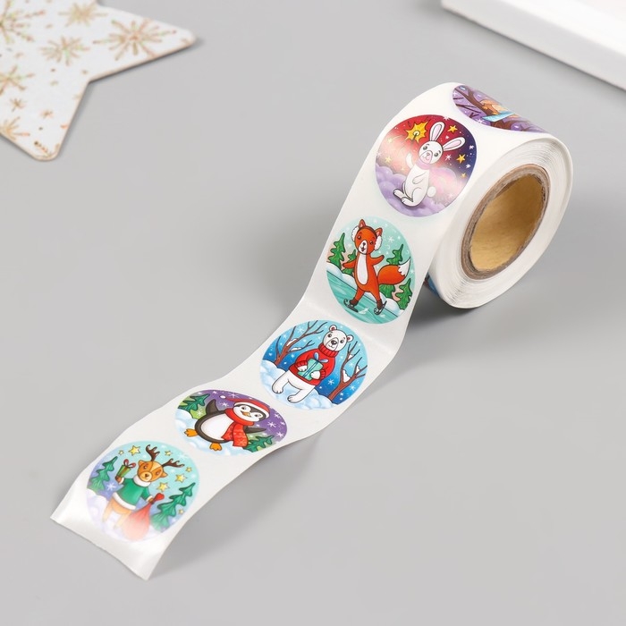 Наклейка бумага "Зверята - Зимние праздники" d=2,5 см 252 шт в рулоне