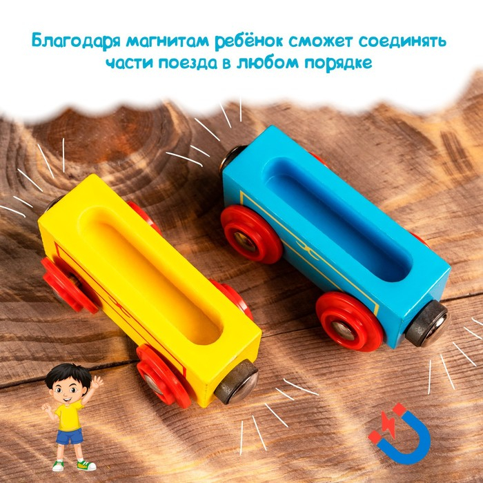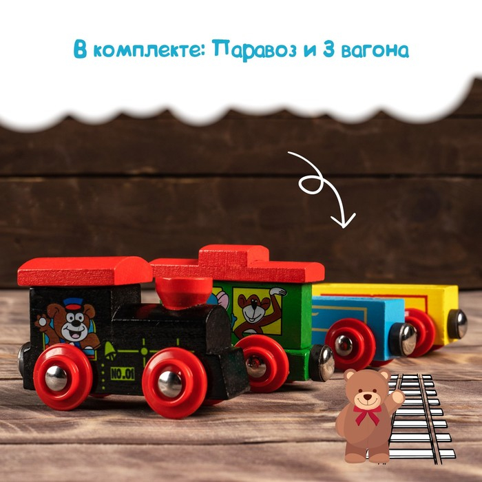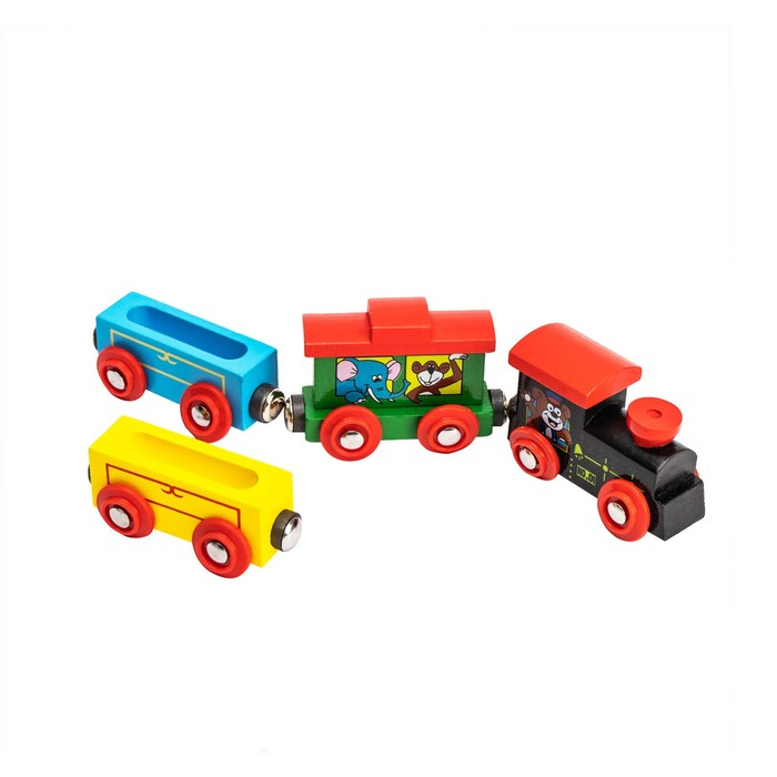 Паровоз и 3 вагона с картинками зверей, магнитный