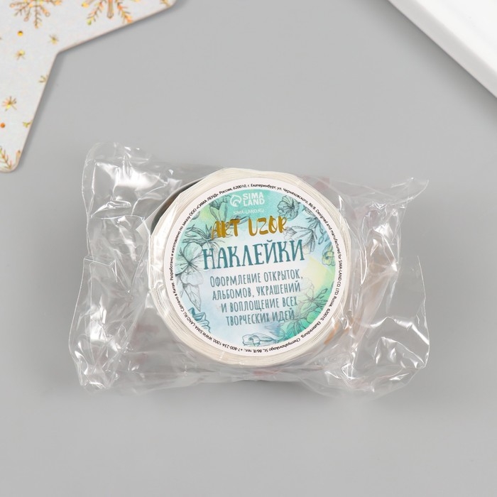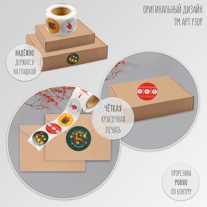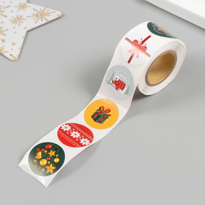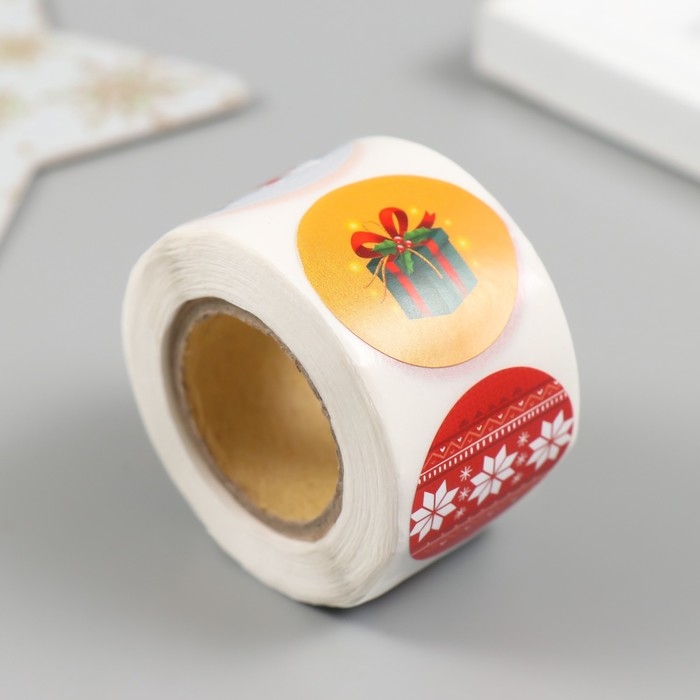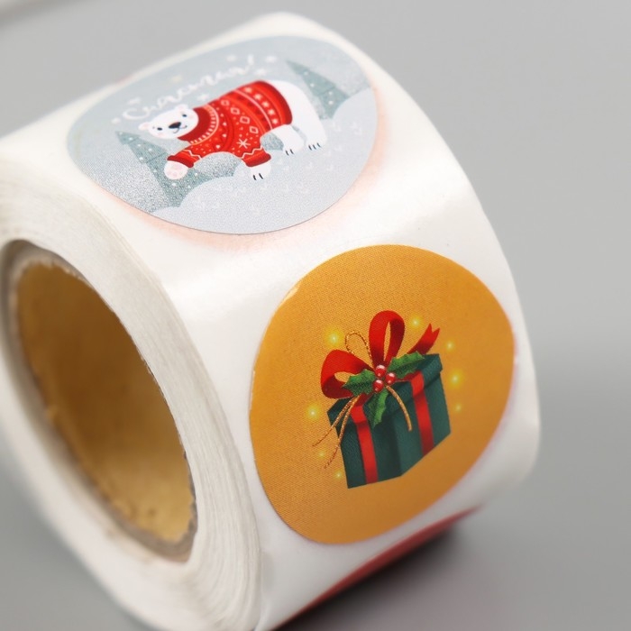 Наклейка бумага "Мишка и олень новогодние" d=2,5 см 252 шт в рулоне