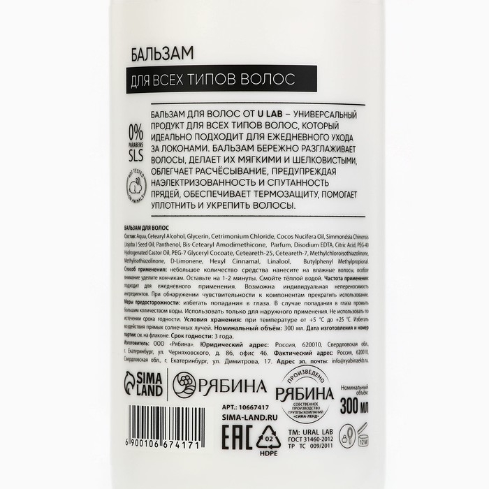 Бальзам для всех типов волос, 300 мл, аромат цветочный, U LAB