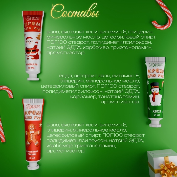 Подарите себе и близким уютные моменты заботы с нашим уникальным набором кремов для рук. Каждый из этих кремов не только увлажняет и питает кожу, но и погружает в атмосферу праздника, вызывая воспоминания о новогодних чудесах.