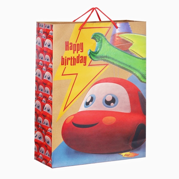 Пакет подарочный крафт "Happy Birthday" 40х31х11.5 см, Тачки