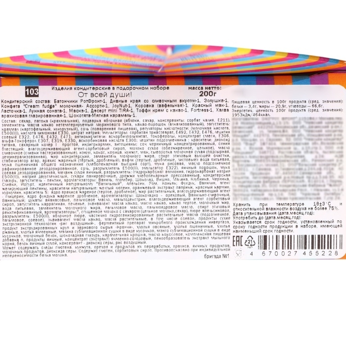 Подарочный набор конфет "От всей души!" — это настоящий источник радости и сладких воспоминаний! Этот набор создан, чтобы сделать любой момент особенным, наполнив его атмосферой праздника и веселья. Набор "Веселый праздник" включает в себя разнообразные сладости: от нежных шоколадных конфет до ярких фруктовых карамелек. Особенно стоит отметить необычную упаковку: она выполнена в ярких, праздничных цветах, которые сразу же создают атмосферу праздника. Эта креативная и оригинальная упаковка не только привлекает внимание, но и делает подарок еще более запоминающимся.