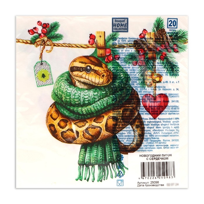 Новогодние салфетки бумажные Home Collection «Новогодний питон с сердечком», 3 слоя, 33х33 см, 20 шт