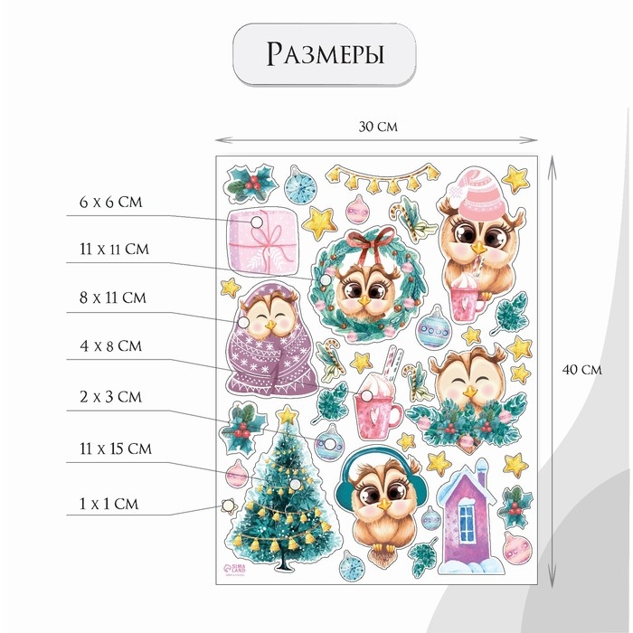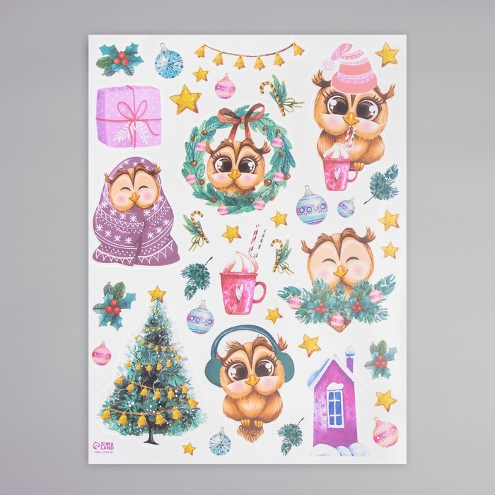 Наклейка интерьерная цветная "Совушки новогодние" 30х40 см