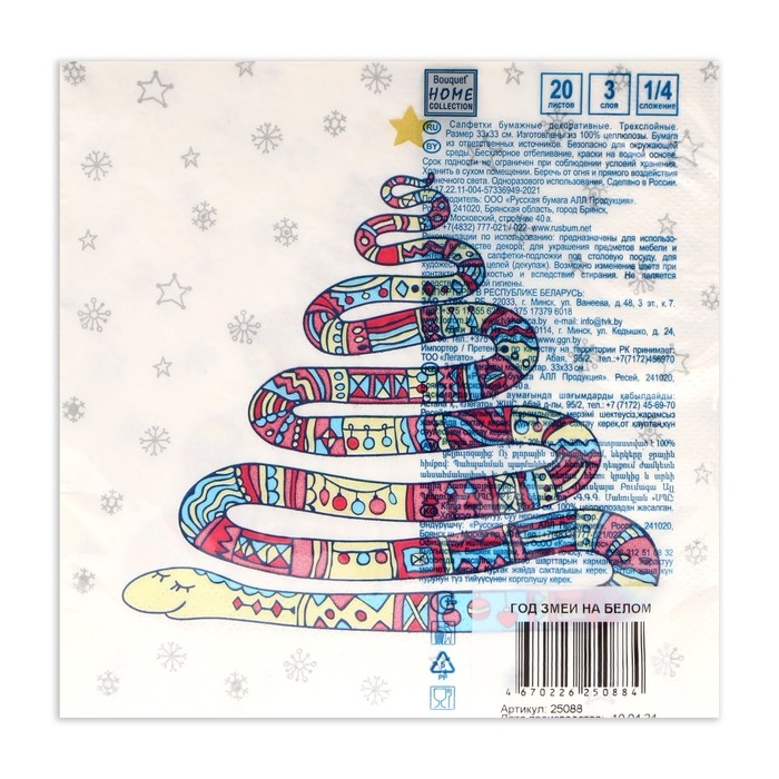 Новогодние салфетки бумажные Home Collection Сlassic «Год змеи на белом», 3 слоя, 33х33 см, 20 шт
