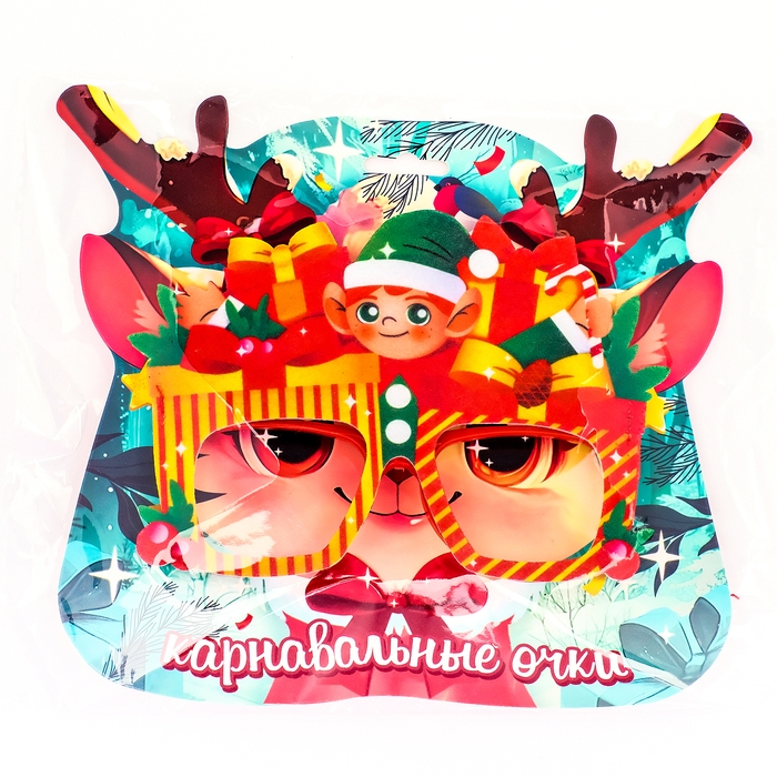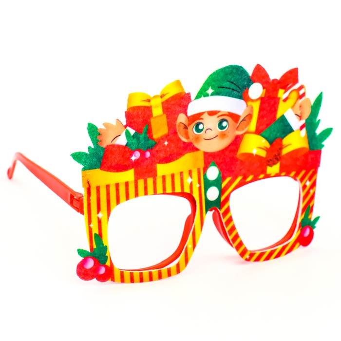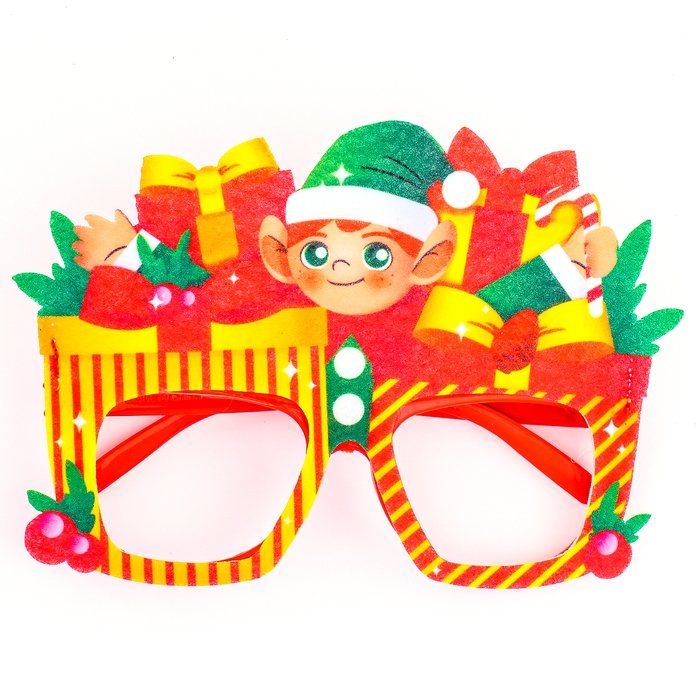 Карнавальный очки «Новогодний подарок» — забавные очки с изображением улыбающегося эльфа, окруженного праздничными подарками, создадут неповторимое праздничное настроение.