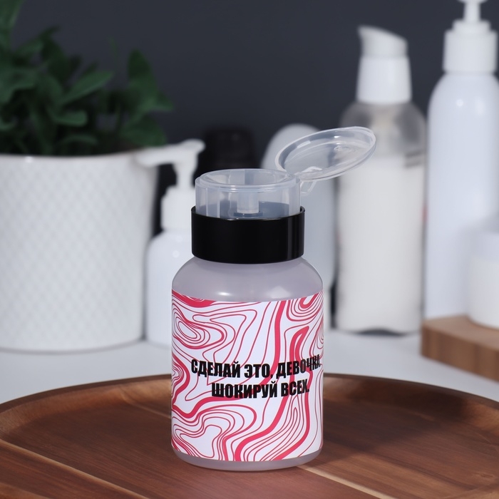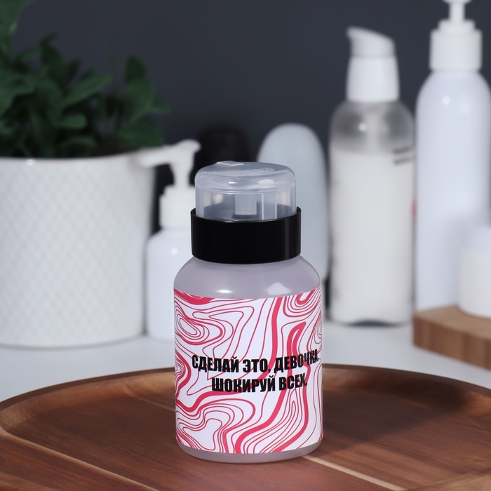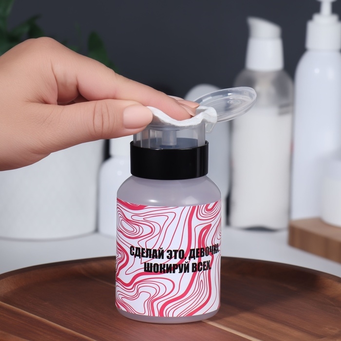 В такой баночке удобно хранить средство для снятия лака, лосьон для лица и другие косметические составы: они не выветрятся и не вытекут. Ёмкостью очень легко пользоваться: просто положите сверху ватный диск и нажмите на помпу, чтобы он пропитался содержимым. Такая система уменьшает расход материала и делает процедуру быстрее и приятнее.