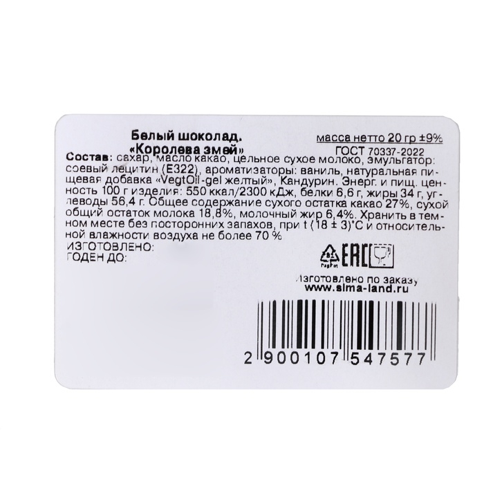 Новый год. Белый шоколад "Королева змей", 20 г