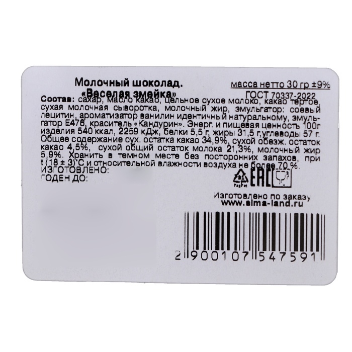 Новый год. Молочный шоколад "Веселая змейка", 30 г