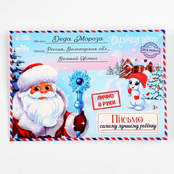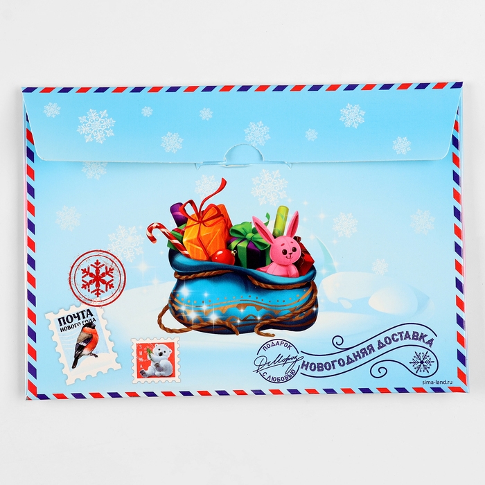 - Конверт с традиционным зимним дизайном – порадуйте своего маленького мечтателя, получившего письмо от самого Деда Мороза!
