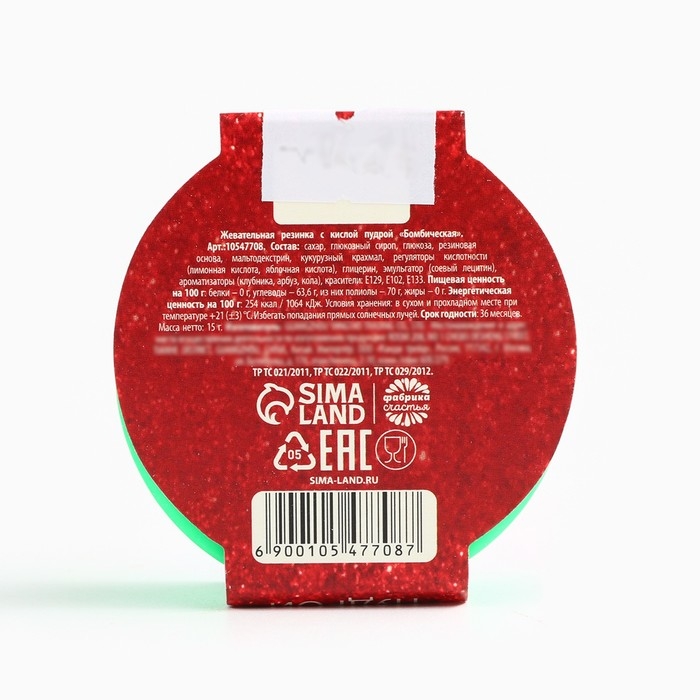 Состав: сахар, глюкозный сироп, глюкоза, резиновая основа, кукурузный крахмал, регуляторы кислотности (лимонная кислота, яблочная кислота), глицерин, эмульгатор (соевый лецитин), ароматизаторы ( клубника, арбуз, кола), красители: Е129, Е102, Е133. Срок годности: 36 месяцев Масса нетто: 15 г.