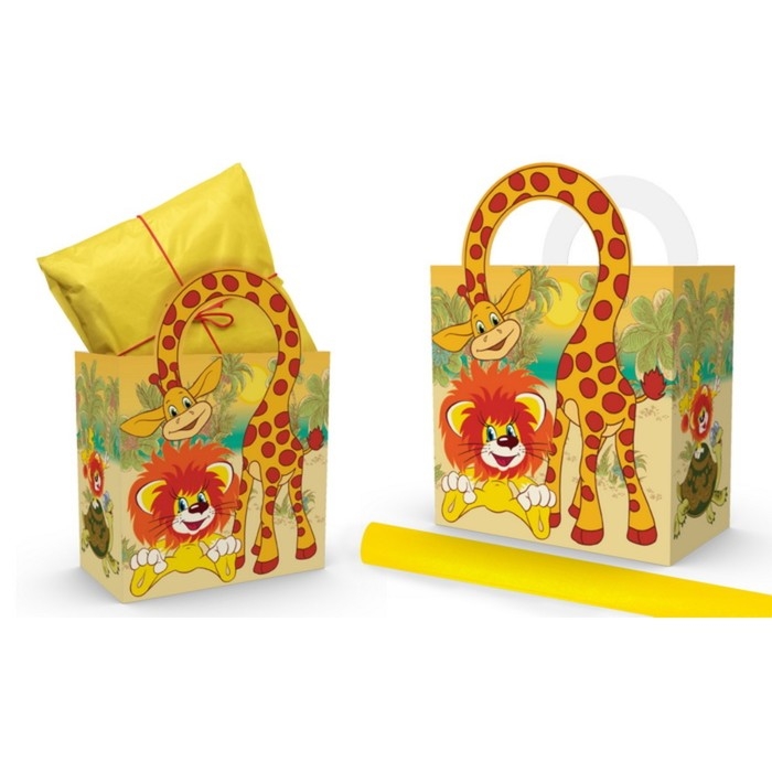 Пакет подарочный с упаковочной бумагой тишью, 22х22х12 см, Львенок и Черепаха