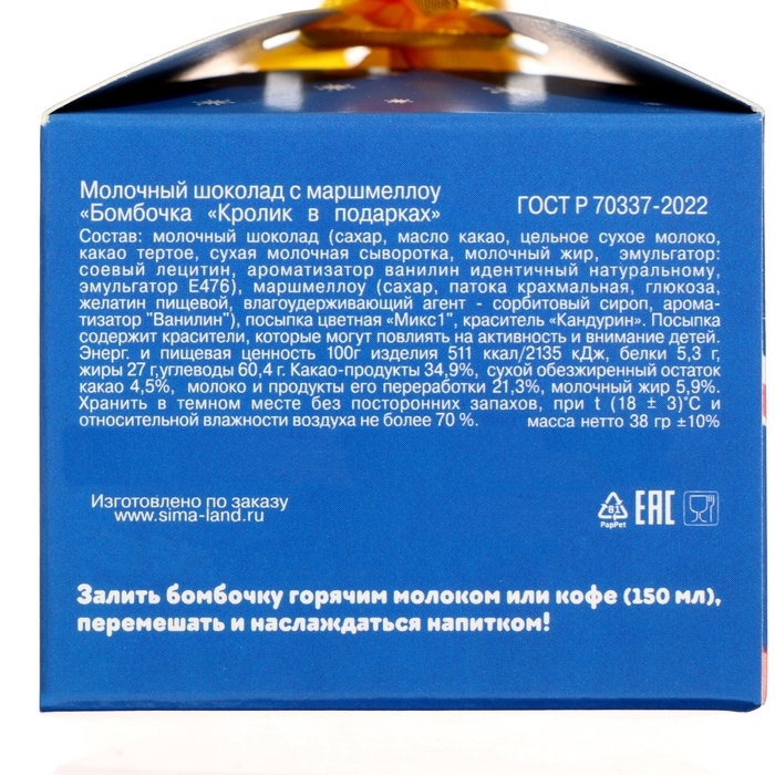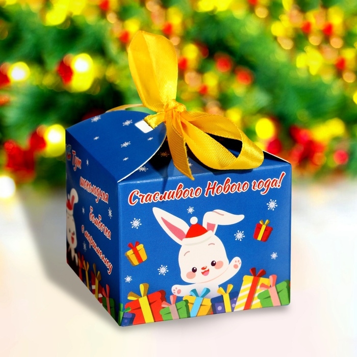 Упаковка украшена милым кроликом, который утопает в подарках на Новый год и Рождество. Каждый элемент оформления выполнен с любовью и заботой, чтобы подарить вам не только вкусные моменты, но и теплые воспоминания.