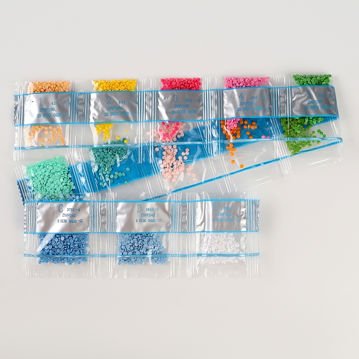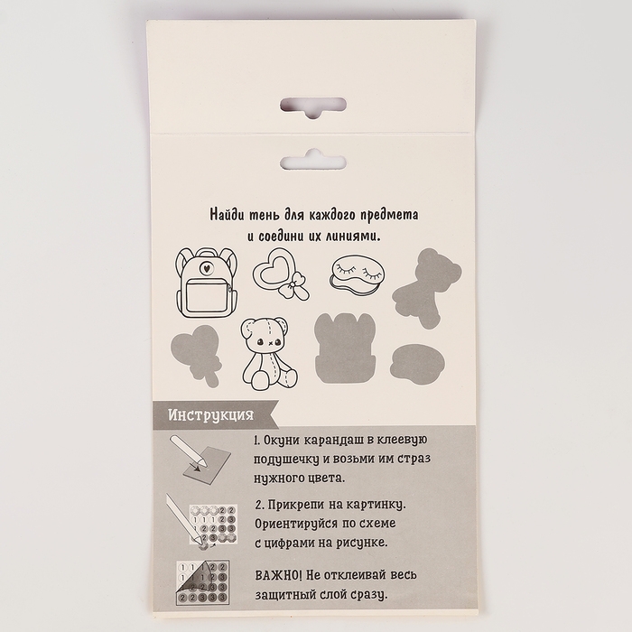 Ребёнку предстоит разложить карандашом кристаллики, постепенно заполняя рисунок элементами соответствующего цвета. Основа с клеевым покрытием будет надёжно удерживать стразы.