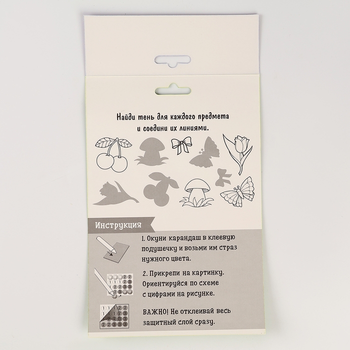 Ребёнку предстоит разложить карандашом кристаллики, постепенно заполняя рисунок элементами соответствующего цвета. Основа с клеевым покрытием будет надёжно удерживать стразы.