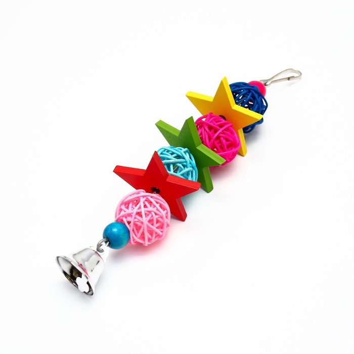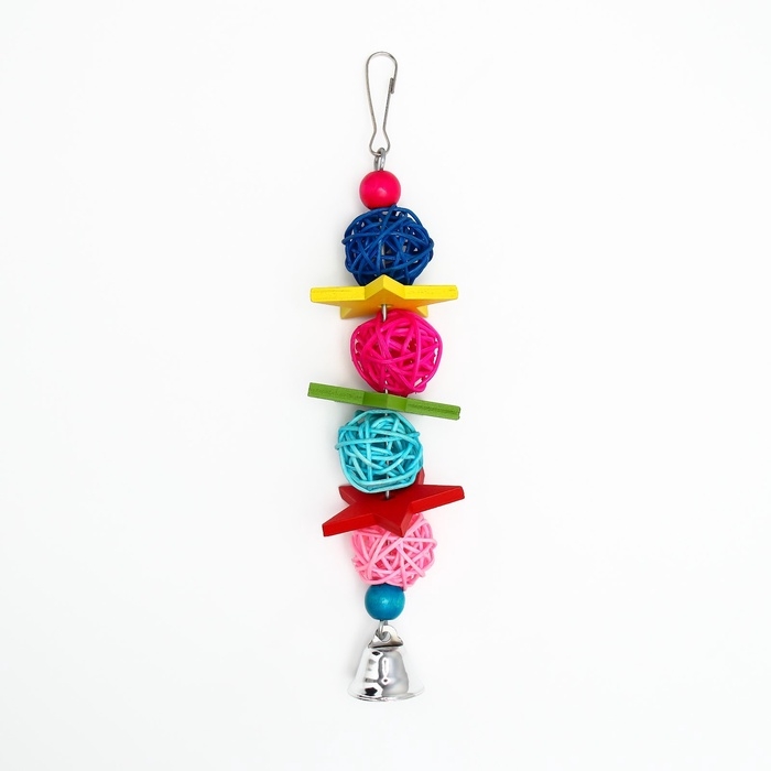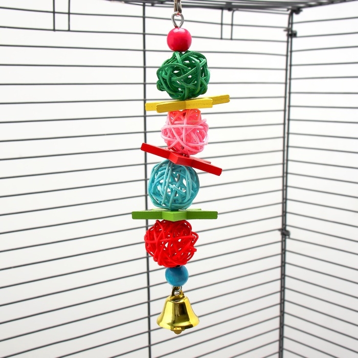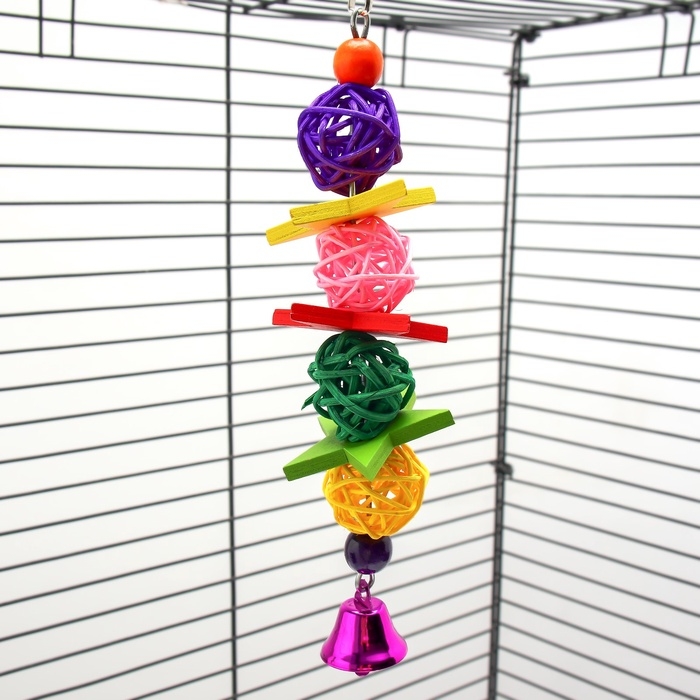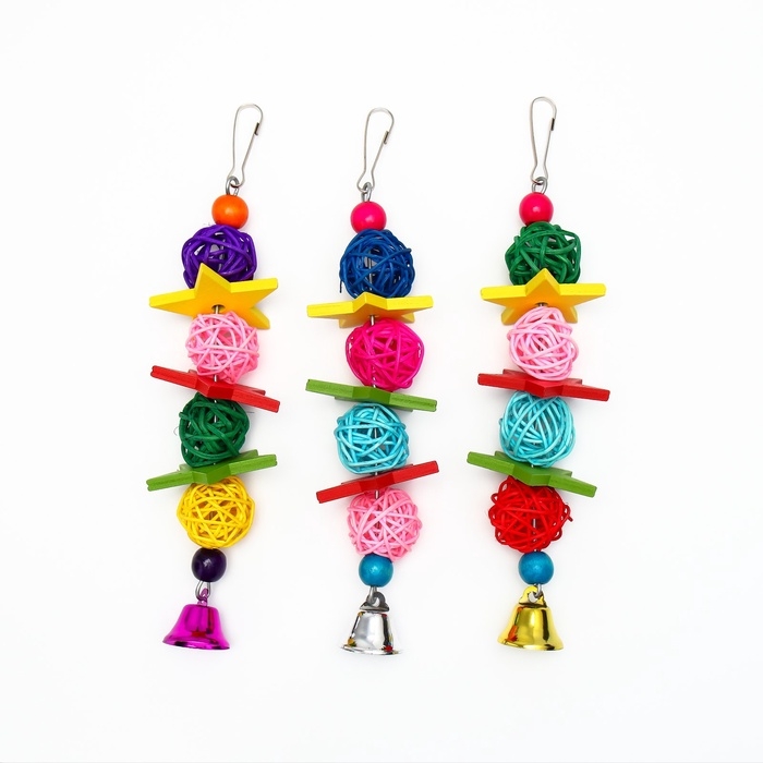 Игрушка выполнена из качественных, безопасных для птиц материалов, что делает ее надежным выбором для ваших любимцев. Все компоненты, включая колокольчик и бусины, тщательно протестированы на отсутствие токсичных веществ, что гарантирует безопасность вашего питомца во время игры.