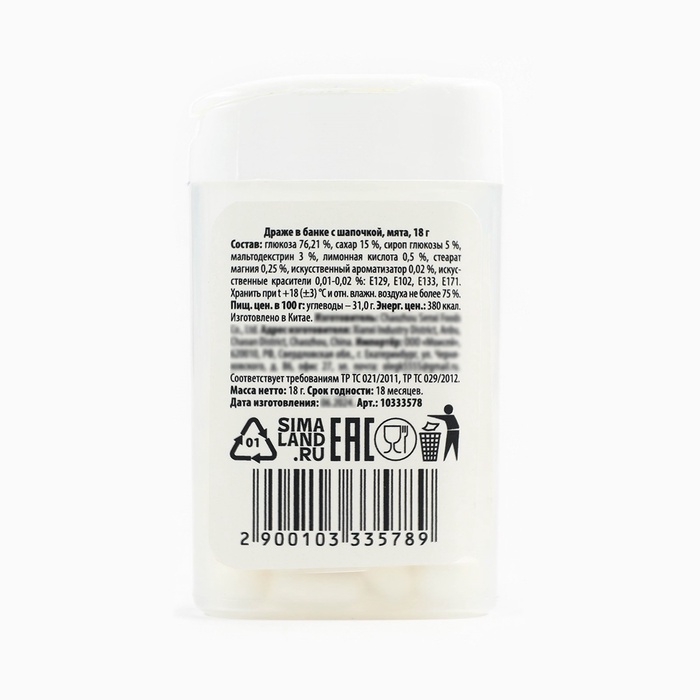 Состав: глюкоза 76,21 %, сахар 15 %, сироп глюкозы 5 %, мальтодекстрин 3 %, лимонная кислота 0,5 %, стеарат магния 0,25 %, искусственный ароматизатор 0,02 %, искусственные красители 0,01-0,02 % E129, E102, E133, E171.