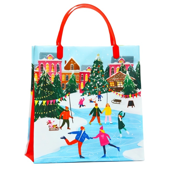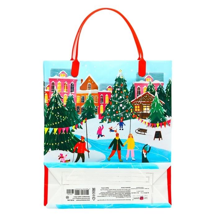 Праздничный дизайн с яркими новогодними элементами, такими как снежинки, ёлочные игрушки и зимние пейзажи, создаст особую атмосферу ожидания чуда и уюта. Удобные ручки-сумка обеспечивают комфорт при переноске, а вместительный размер позволяет легко упаковать и транспортировать даже крупные подарки.