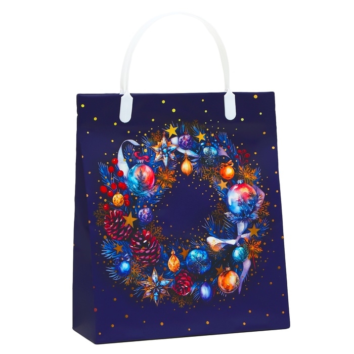 Праздничный дизайн с яркими новогодними элементами, такими как снежинки, ёлочные игрушки и зимние пейзажи, создаст особую атмосферу ожидания чуда и уюта. Удобные ручки-сумка обеспечивают комфорт при переноске, а вместительный размер позволяет легко упаковать и транспортировать даже крупные подарки.