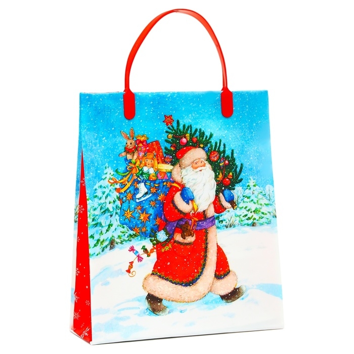 Праздничный дизайн с яркими новогодними элементами, такими как снежинки, ёлочные игрушки и зимние пейзажи, создаст особую атмосферу ожидания чуда и уюта. Удобные ручки-сумка обеспечивают комфорт при переноске, а вместительный размер позволяет легко упаковать и транспортировать даже крупные подарки.