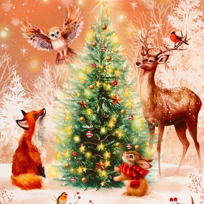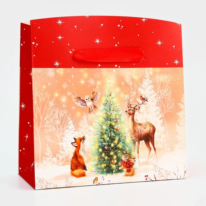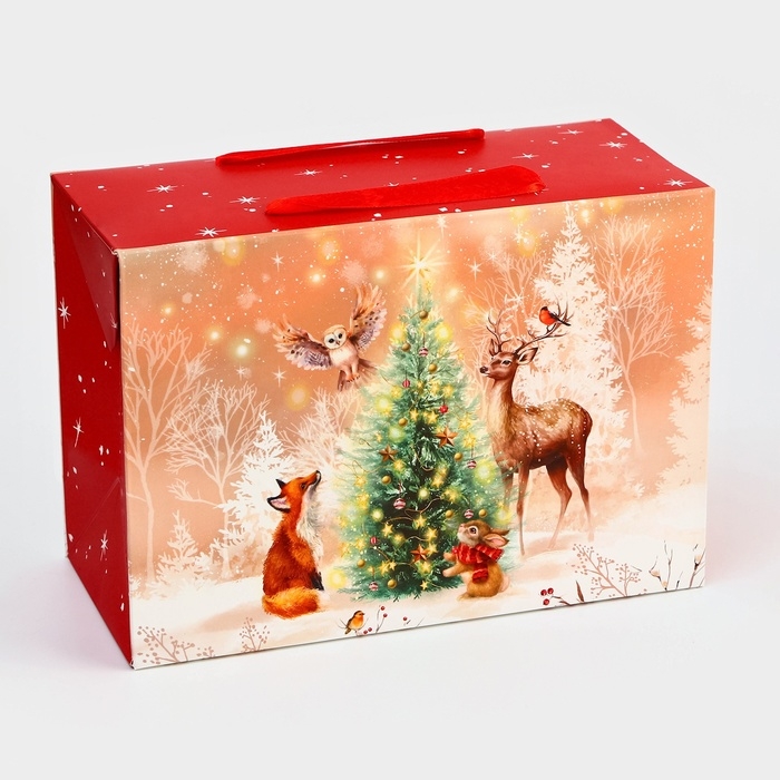 Новый год. Сумка-коробка подарочная новогодняя "Зверята в лесу", 23 х 16 х 11 см.