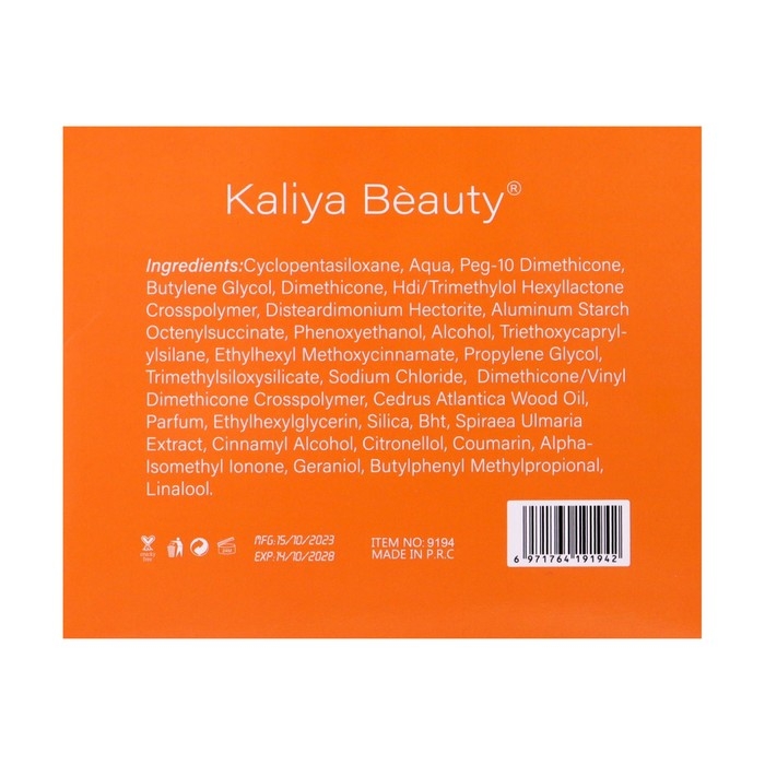 Состав: циклопентасилоксан, аква, пэг-10 диметикон, бутиленгликоль, диметикон, кроссполимер, триметилолгексиллактона, дистеардимоний гекторит, октенилсукцинат алюминиевого крахмала‚феноксиэтанол, спирт, триэтоксикаприлилсилан, этилгексилметоксициннамат, пропиленгликоль,триметилсилоксисиликат, хлорид натрия, диметикон/винилдиметикон кроссполимер, древесное масло сеаги анапйса, парфюмированная вода, этилгексилглицерин, диоксид кремния, экстракт спиреи ульмариевой,циннамиловый спирт,цитронеллол, кумарин, альфа-изометилолонон, гераниол, бутилфенилметилпропионал, линалоол.
