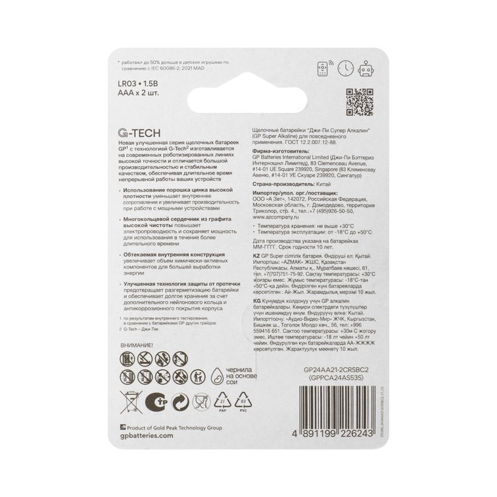 Батарейка алкалиновая GP Super, AAA, LR03-2BL, 1.5В, блистер, 2 шт.