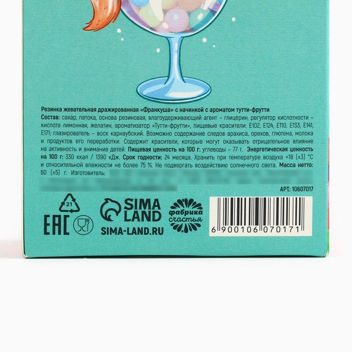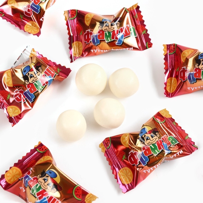 Состав: сахар, патока, полимерная основа, влагоудерживающий агент - глицерин, регулятор кислотности - кислота лимонная, ароматизаторы, пищевые добавки: Е100, Е120, Е133, Е142, Е161с, Е170; глянцеватель - капол.