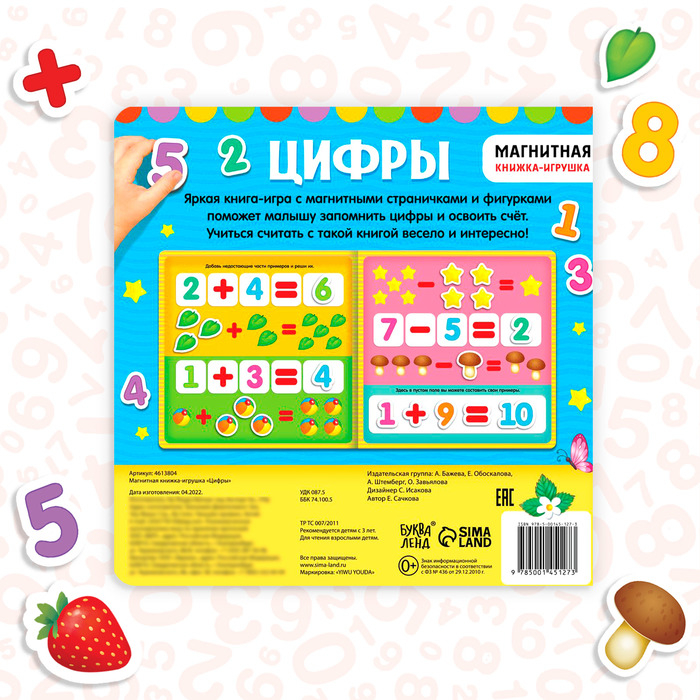 Внутри ребёнок найдёт интересные задания, которые нужно выполнять, используя магнитные цифры. Малыш будет составлять примеры и освоит счёт.