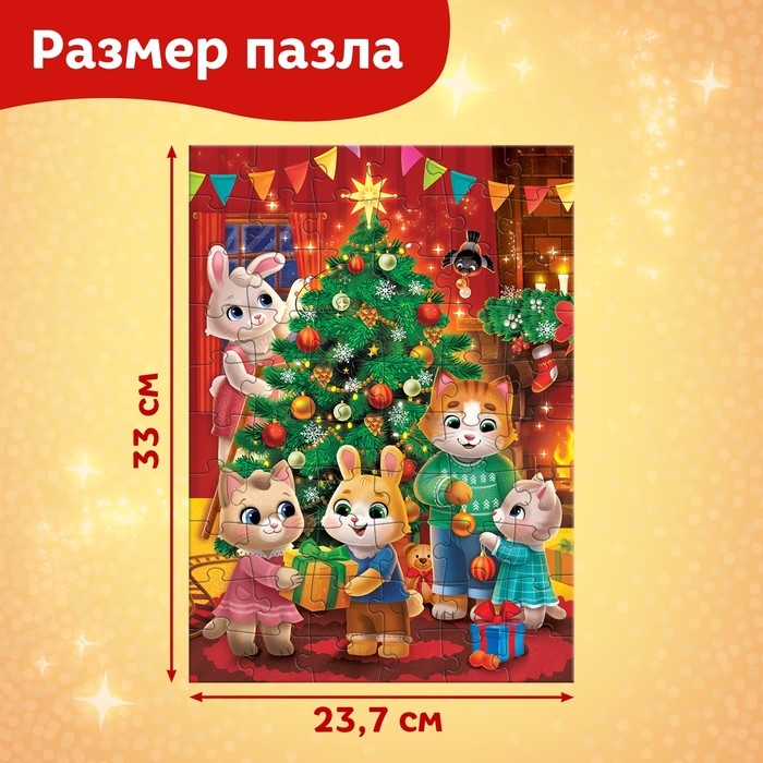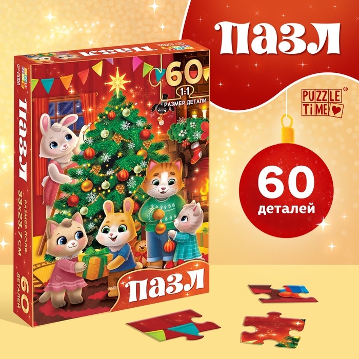 - Ребёнок соберёт все 60 деталей в одно целое и получит красочную картинку размером 33 × 23,7 см.