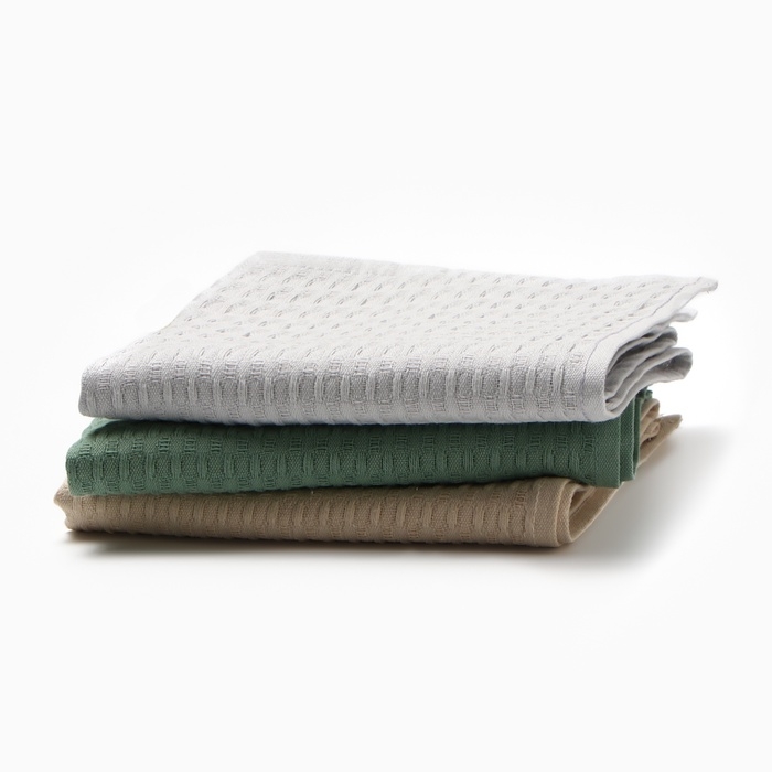 Набор кух.полотенец "Доляна" сер,зел, беж 35х60см-3шт., 100% хл, крупная вафля, 220 гр/м2