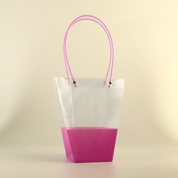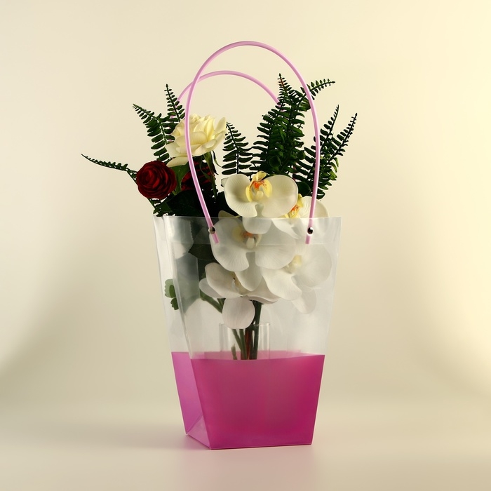 Сумка размером 26х24х12 см отличается лёгкостью и удобством в использовании. Элегантные ручки обеспечивают комфортное перенесение, а прочные швы и устойчивое дно гарантируют надёжную фиксацию букета. Прозрачный материал позволяет цветам оставаться в центре внимания, подчёркивая их естественную красоту и свежесть.