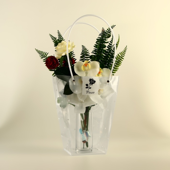 Сумка размером 26х24х12 см отличается лёгкостью и удобством в использовании. Элегантные ручки обеспечивают комфортное перенесение, а прочные швы и устойчивое дно гарантируют надёжную фиксацию букета. Прозрачный материал позволяет цветам оставаться в центре внимания, подчёркивая их естественную красоту и свежесть.