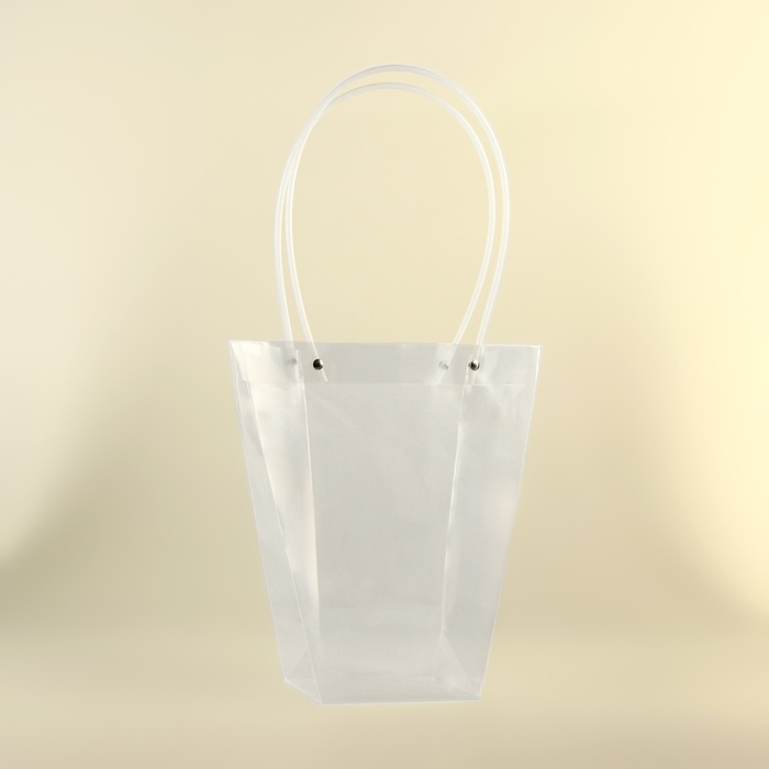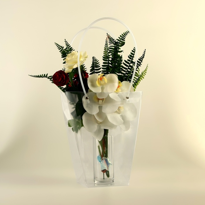 Сумка размером 26х24х12 см отличается лёгкостью и удобством в использовании. Элегантные ручки обеспечивают комфортное перенесение, а прочные швы и устойчивое дно гарантируют надёжную фиксацию букета. Прозрачный материал позволяет цветам оставаться в центре внимания, подчёркивая их естественную красоту и свежесть.
