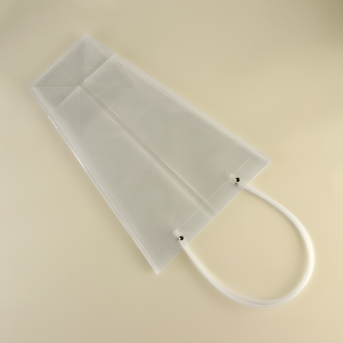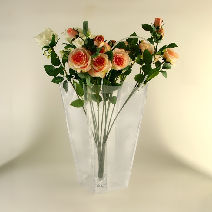 Благодаря внушительным размерам 42.5х29х15 см, сумка вмещает даже самые пышные букеты, создавая для них изящное обрамление. Удобные ручки обеспечивают комфортное перенесение, а устойчивое дно гарантирует надёжную фиксацию цветочной композиции. Прозрачный материал подчёркивает естественную красоту цветов и позволяет им оставаться в центре внимания.