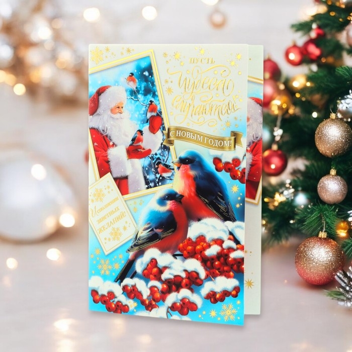 Открытка-евро "С Новым Годом!" конгрев, тиснение, снегири, 11 х 21,5 см