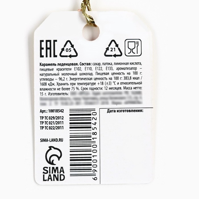 Состав: сахар, патока, лимонная кислота, пищевые красители Е102, Е110, Е122, Е133, ароматизатор – натуральный молочный шоколад.