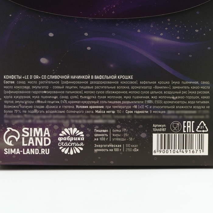 Состав: сахар, масло растительное (рафинированное дезодорированное кокосовое), вафельная крошка (мука пшеничная, сахар, масло кокосовое, эмульгатор – соевый лецитин, пищевые растительные волокна, ароматизатор «Ванилин»), заменитель какао-масла (рафинированное гидрогенизированное пальмовое), молоко сухое обезжиренное, молоко сухое цельное, воздушный рис (мука рисовая, крупа кукурузная, мука пшеничная, сахар, соль), сыворотка сухая молочная, мука пшеничная, жир молочный, какао-порошок, какао тёртое, эмульгаторы: соевый лецитин, Е476, крахмал кукурузный, соль пищевая, разрыхлители: Е500ii, Е503i; ароматизаторы, вода питьевая. Возможно наличие следов арахиса и глютена.