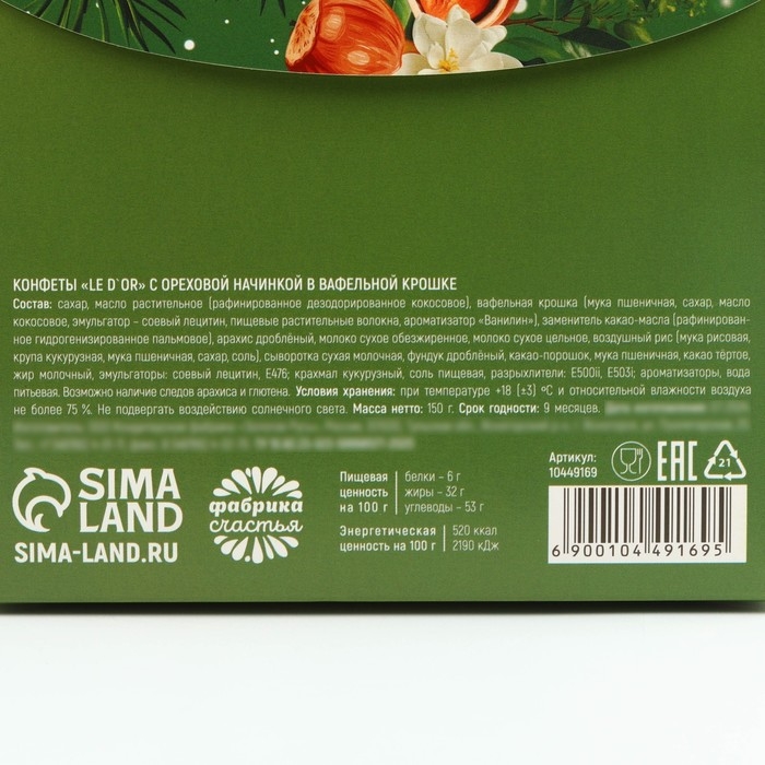 Состав: сахар, масло растительное (рафинированное дезодорированное кокосовое), вафельная крошка (мука пшеничная, сахар, масло кокосовое, эмульгатор – соевый лецитин, пищевые растительные волокна, ароматизатор «Ванилин»), заменитель какао-масла (рафинированное гидрогенизированное пальмовое), арахис дроблёный, молоко сухое обезжиренное, молоко сухое цельное, воздушный рис (мука рисовая, крупа кукурузная, мука пшеничная, сахар, соль), сыворотка сухая молочная, фундук дроблёный, какао-порошок, мука пшеничная, какао тёртое, жир молочный, эмульгаторы: соевый лецитин, Е476; крахмал кукурузный, соль пищевая, разрыхлители: Е500ii, Е503i; ароматизаторы, вода питьевая. Возможно наличие следов глютена.