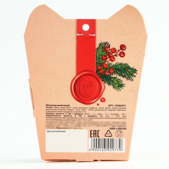 Новый год! Шоколад молочный «Почта», 5 гр х 4 шт